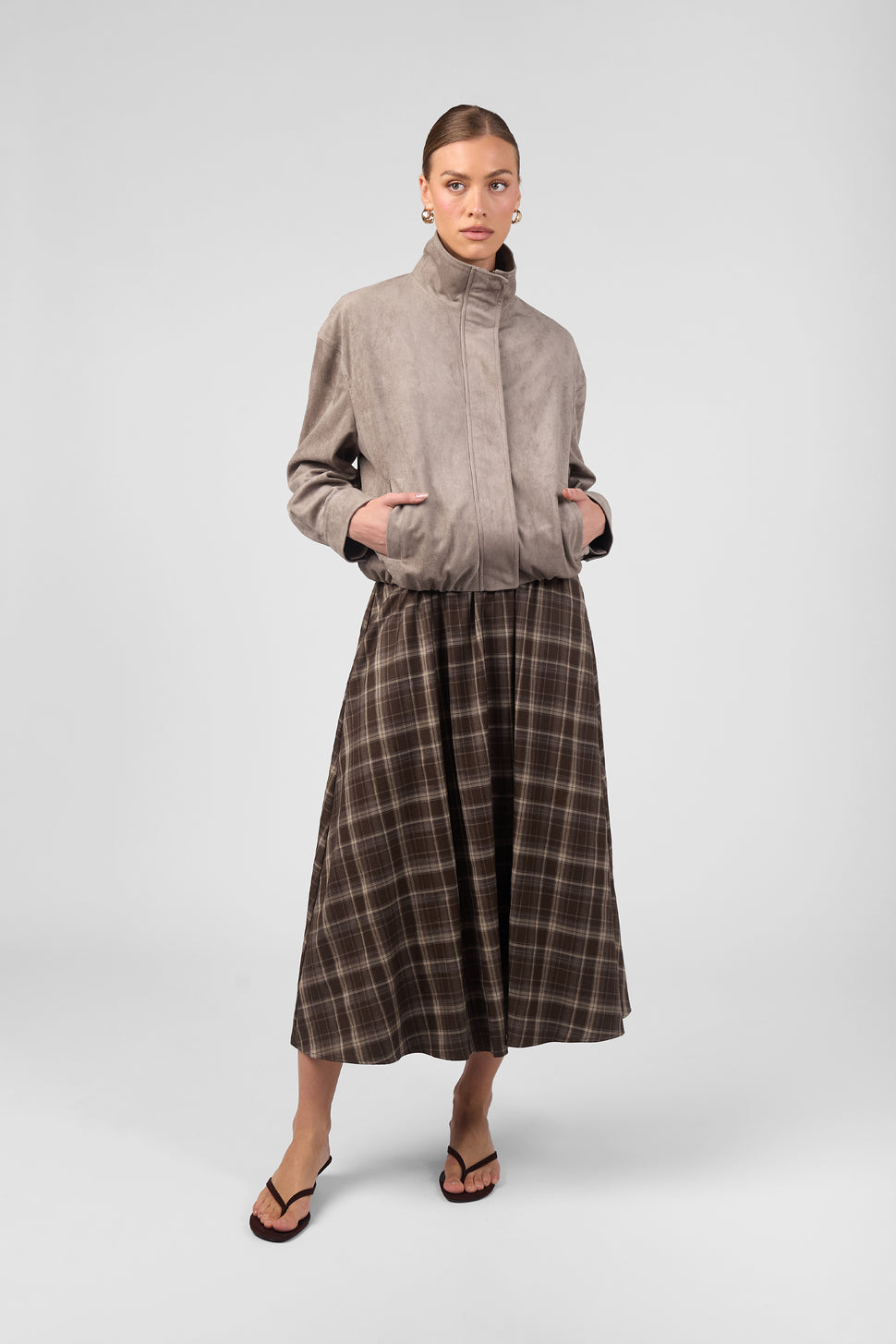 Our model is wearing a size S jacket. She usually takes a standard AU 8 size, is 5'8.5" (175 cm) and has a 65 cm waist, 79 cm bust, 89 cm hips.